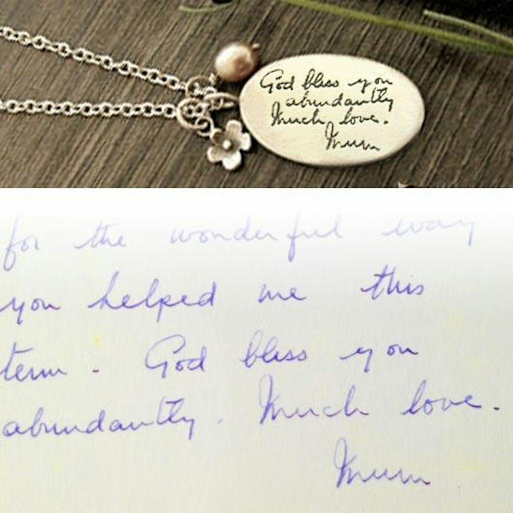 A few weeks before my wife's birthday I heard her mention to a friend that she wanted a pendant with her parent's handwriting. I reached out to Luxe that day, emailed images of the handwriting, and had two custom, double sided pendants ready in time for her birthday. My wife loved the pendants and they made her birthday extra special. A birthday she'll never forget. Luxe went above and beyond with customer service for me and for that I would give 6 stars out of five if I could. Thank you!!!