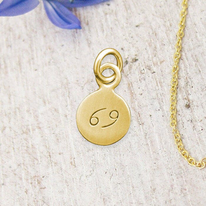 This gold astrological charm features the sun symbol for the sign of Cancer. The symbol on this Gold Cancer Zodiac charm is that of the Crab. The gold Cancer charm itself is a small disc that can be mixed and matched with any item in our collection, worn on it's own, or in combination with other gold zodiac charms. Cancers are said to be nurturing and tenacious.
