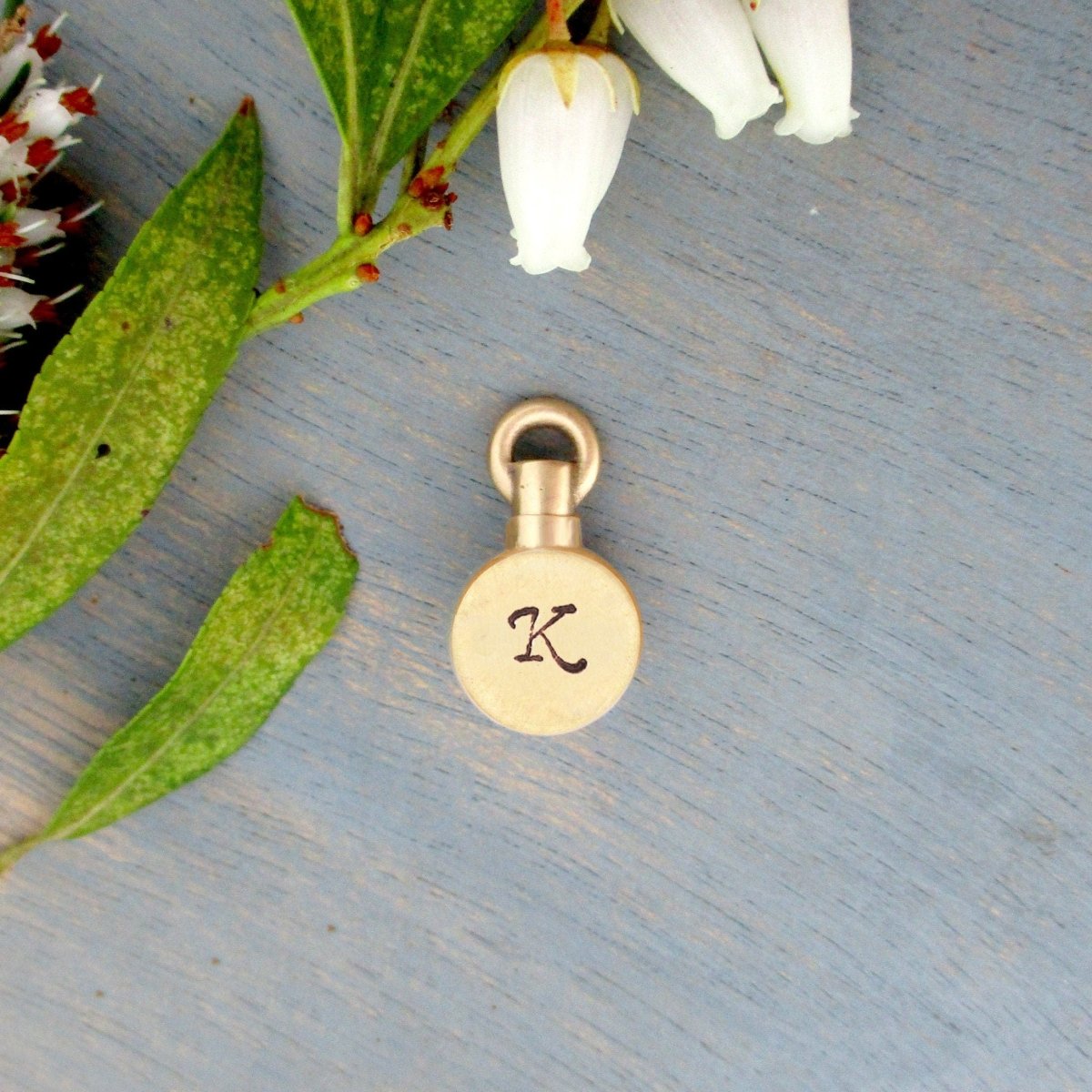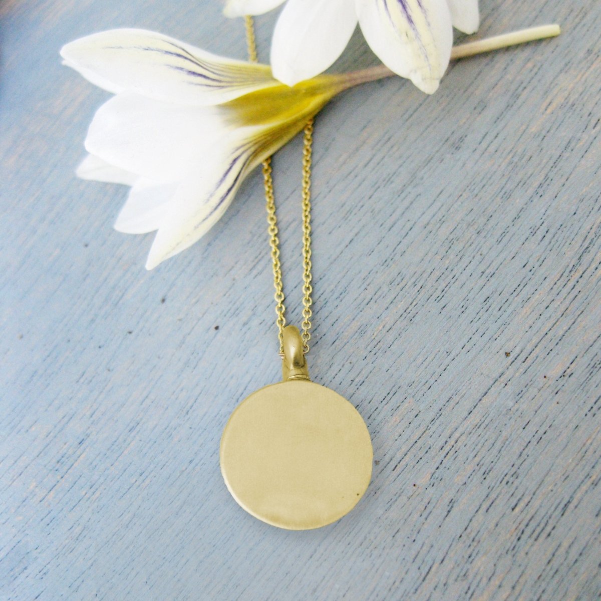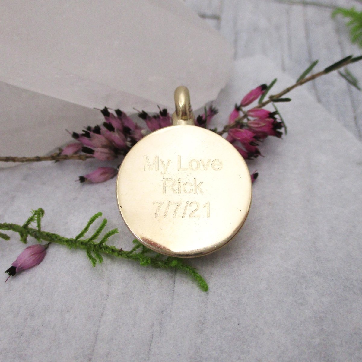 Add a name or a date hand stamped in our small font, up to three lines of 10 characters each on the back of the pendant. PLEASE REQUEST A CUSTOM ORDER FOR THIS AS THERE IS AN ADDITIONAL CHARGE.