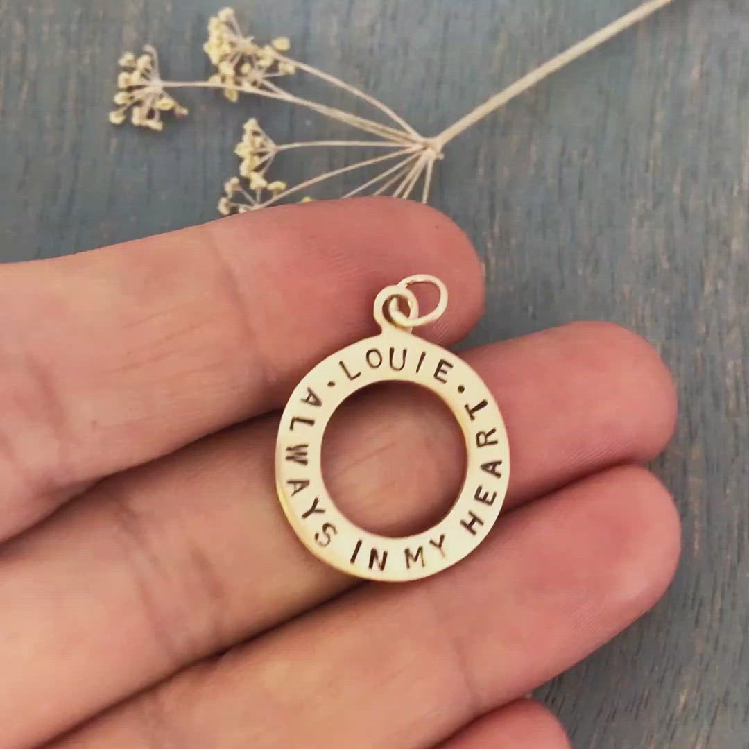 This Open Circle Charm in 14 Karat gold can be personalized with names, dates, or favorite sayings. Our most popular shape, this personalized gold charm makes an ideal keepsake. Choose this gold personalized charm as the main pendant in a necklace or bracelet. Our Gold Charms come with a quality stamp that reads 14K, as well as our trademark on the back of the charm. It is your guarantee that you are getting solid karat gold. In the case where you do not want the stamp because you want to personalize the back as well as the front, let us know and we can leave the stamps off. Our personalized gold charms come with a soft matte finish that brings out the detail of the personalization, but you may request a shiny finish in "additional comments".
