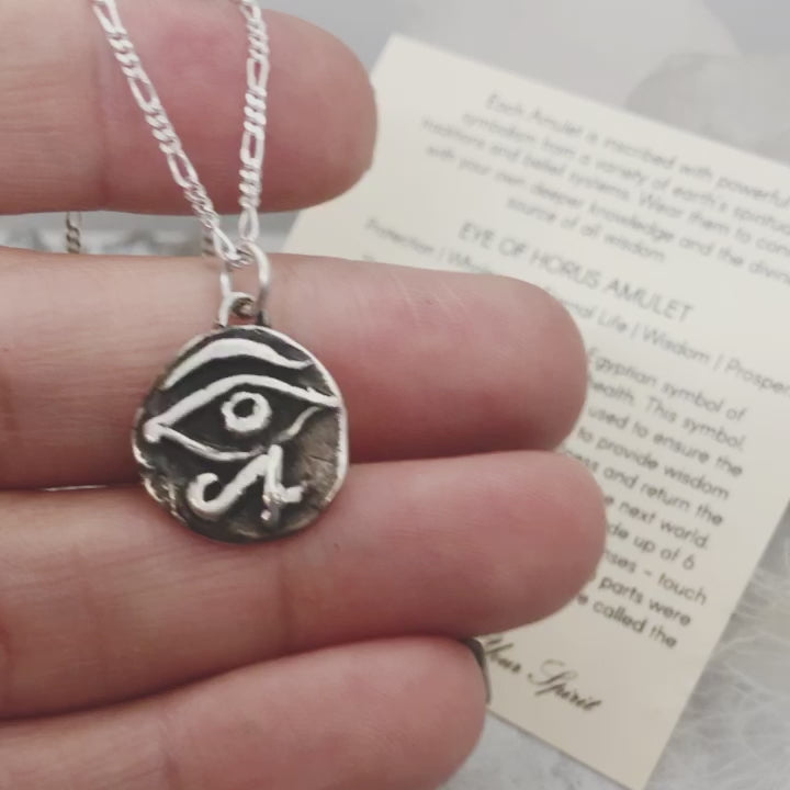 This Eye of Horus pendant is carved by hand and cast in silver, and comes with a card describing its meaning.