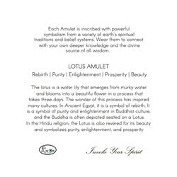 The Lotus Amulet is sculpted by hand and cast in sterling silver. It represents rebirth, purity, enlightenment, prosperity and beauty. The lotus is a water lily that emerges from murky water and blooms into a beautiful flower, in a process of three days. The wonder of this process has inspired many cultures. In Ancient Egypt it is a symbol of rebirth. In Buddhist culture it is a symbol of purity and enlightenment. The Buddha is often depicted seated upon a lotus flower. In the Hindu religion the lotus is also revered for it's beauty, and symbolizes purity, enlightenment and prosperity.