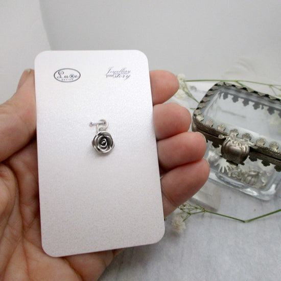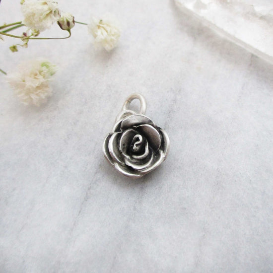A simple, classic bloom, wrapped petals are oxidized to bring out the charm and detail of this solid Rose charm.